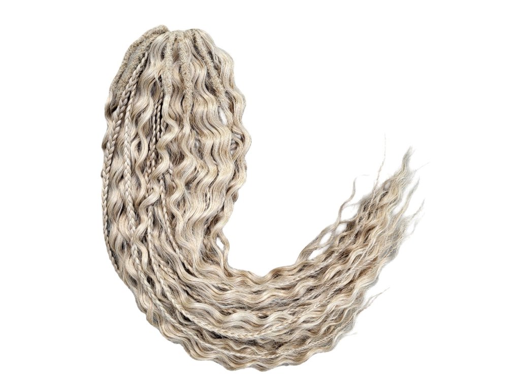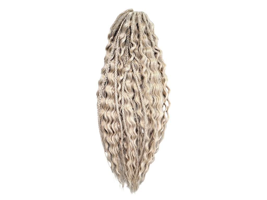Kučeravé vlásky s dredmi a copíkmi tzv. dredo-brčky štýlu Ariel Mix vyrobené zo 100% vysoko kvalitného kanekalonu ako set, sú ideálne najmä pre metódu crochet braids (háčkovanie) ako africký štýl (uchytávanie prameňov vláskov do vytvorených cornrows copíkov - pripletaných vrkôčikov z vlastných vlasov na hlave). Tento set s kučeravými vláskami typu Ariel zo 100% kvalitného kanekalonu je však možné použiť aj na vytvorenie klasickejších či extravagantných účesov európskeho štýlu, ako sú rôzne príčesky a účesy na svatby či iné slávnosti. Avšak zároveň ich možno využiť aj pre tvorbu ručne robených parochní s mixom dredov a copíkov metódou Crochet Braids. Hmotnosť balíka tohto setu vláskov je 300g, takže na jednu celú hlavu Vám bude stačiť 1 takýto balík (obsahuje 3 zväzky vláskov po 100g), aby Vaše spravené dredo-brčky dobre vyzerali, boli husté a javili sa skoro ako vaše vlastné.