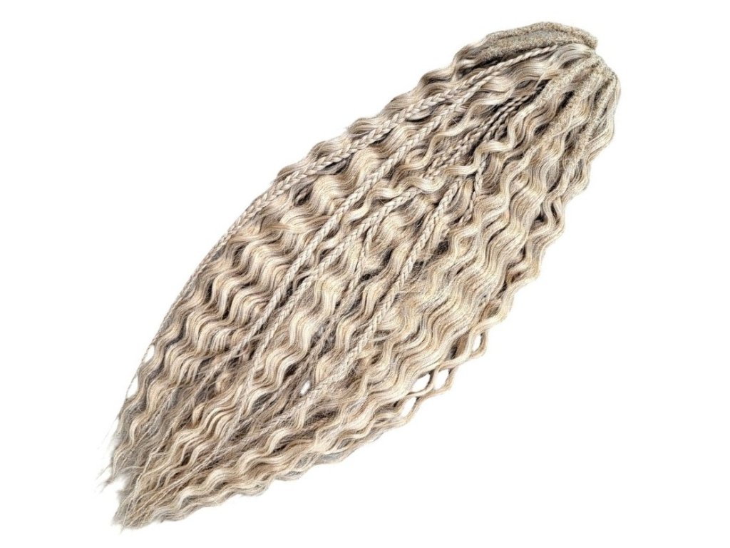 Tento konkrétny set dredo-brčiek s kučeravými vláskami je farby blond - svetlá blond melír #613F o dĺžke prameňov 60cm štýlu Ariel a hmotnosti balíka 300g, ideálne pre tvorbu moderného afrického štýlu s kučierkami, značky Africké Vlasy, ktoré sú jedni z najkvalitnejších Crochet Braids vláskov na trhu pre tvorbu kvalitného a trvácneho afro-príčesku, alebo aj iných vlasových štýlov, ktoré s nimi môžete vytvoriť. Crochet Braids sety pripravené zo 100% kanekalon vláskov sa už dlhé roky vyrábajú jednak najmä čistých farieb (čierna, hnedá, blond, bordová, sivá apod.), pričom však pár rokov sú dostupné už aj v 2-farebných kombináciách (ombré). V najbližšej dobe očakávam, že sa na trhu objavia dokonca už aj moderné 3-farebné ombré kombinácie.