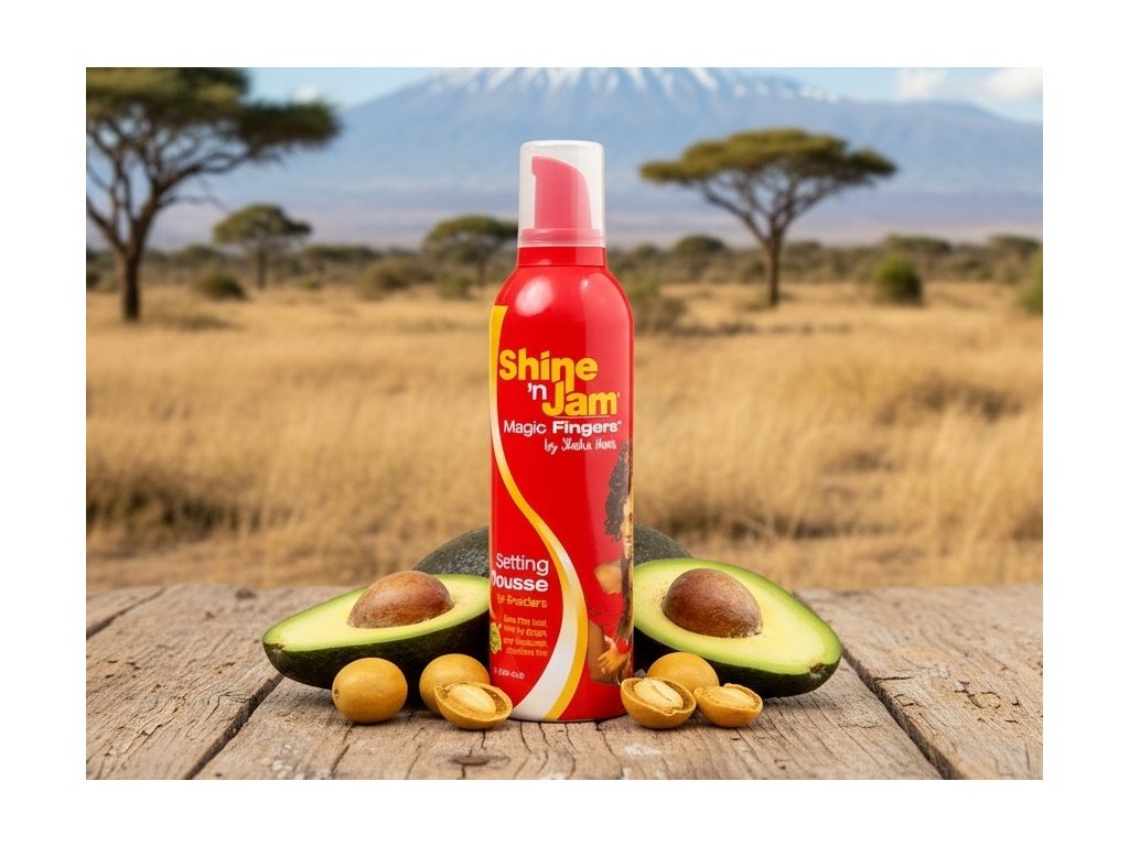 Táto pena na vlasy s avokádovým a jojobovým olejom je určená pre všetky typy vlasov. Táto pena zabezpečuje silnú fixáciu aj malých neposlušných a nepoddajných vlasov afrického typu a vláskov mulatiek. Avokádový a jojobový olej obsiahnutý v tejto pene vyživujú vlasovú pokožku, zjemňujú vlasy a pomáhajú prirodzene regulovať jej hydratačné vlastnosti. Shine 'n Jam Setting Mousse pena revitalizuje vlasy a dodáva vlasom príjemný a prirodzený lesk. Priťahuje a absorbuje vlhkosť na pokožke pod vlasmi a tým pomáha chrániť vlásky a pokožku pred jej vysušovaním.