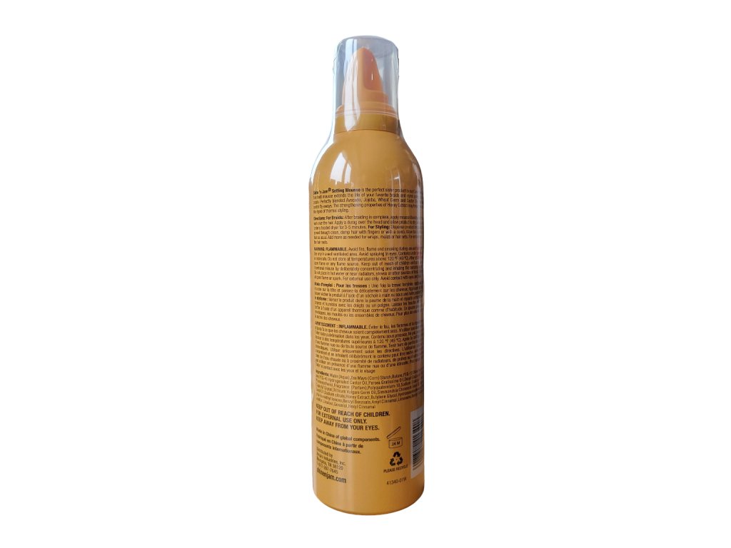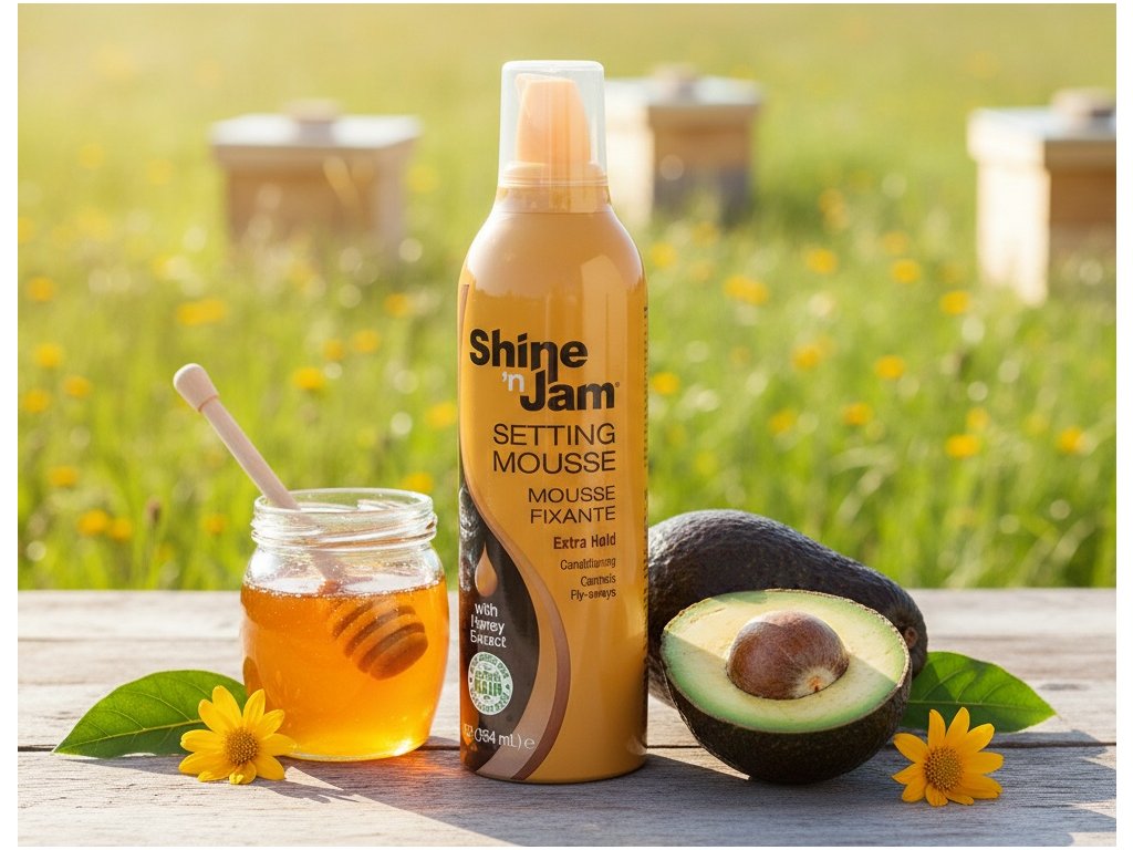 Táto pena na vlasy s medovým extraktom a avokádovým olejom je určená pre všetky typy vlasov. Táto pena zabezpečuje veľmi silnú fixáciu aj malých neposlušných a nepoddajných vlasov afrického typu a vláskov mulatiek. Medový extrakt a avokádový olej obsiahnutý v tejto pene vyživujú vlasovú pokožku, zjemňujú vlasy a pomáhajú prirodzene regulovať jej hydratačné vlastnosti. Shine 'n Jam Setting Mousse pena revitalizuje vlasy a dodáva vlasom príjemný a prirodzený lesk. Priťahuje a absorbuje vlhkosť na pokožke pod vlasmi a tým pomáha chrániť vlásky a pokožku pred jej vysušovaním.